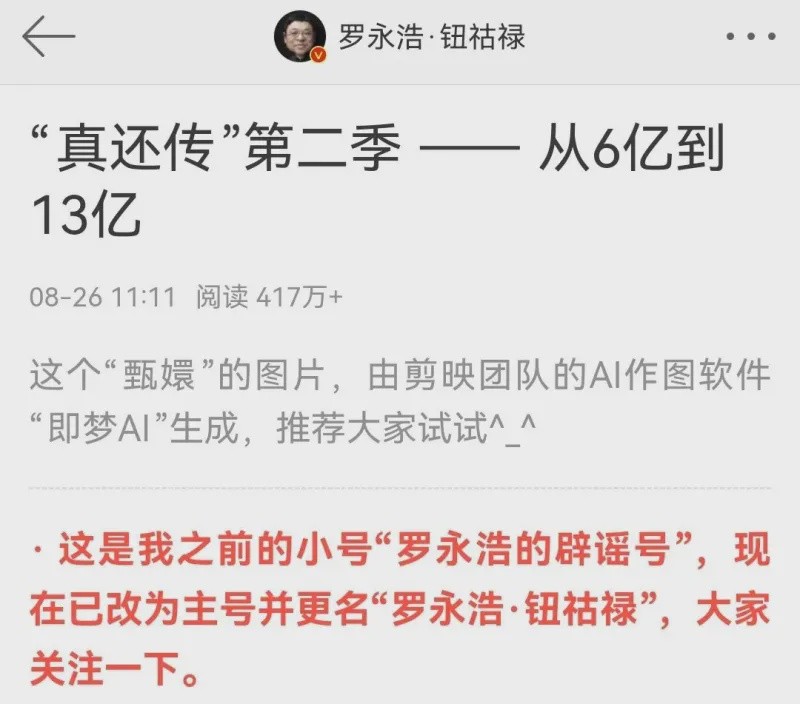 8 月 26 日,羅永浩將微博小號 “羅永浩的闢謠號” 更名 “羅永浩·鈕祜祿”,以大女主甄嬛的高調姿態,重回社交媒體界。