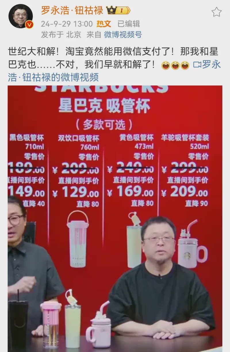 9 月 29 日,@羅永浩·鈕祜祿還發博稱,“世紀大和解!淘寶竟然能用微信支付了!那我和星巴克也……不對,我們早就和解了!”