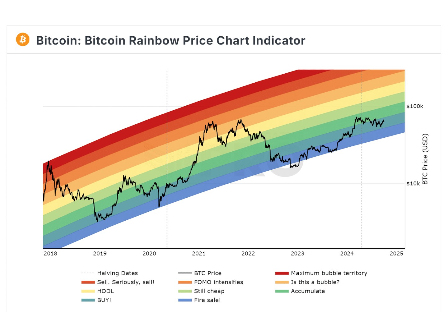 就背景而言,彩虹圖根據歷史價格評估 BTC 的估值,但通過彩虹色彩進行視覺呈現。