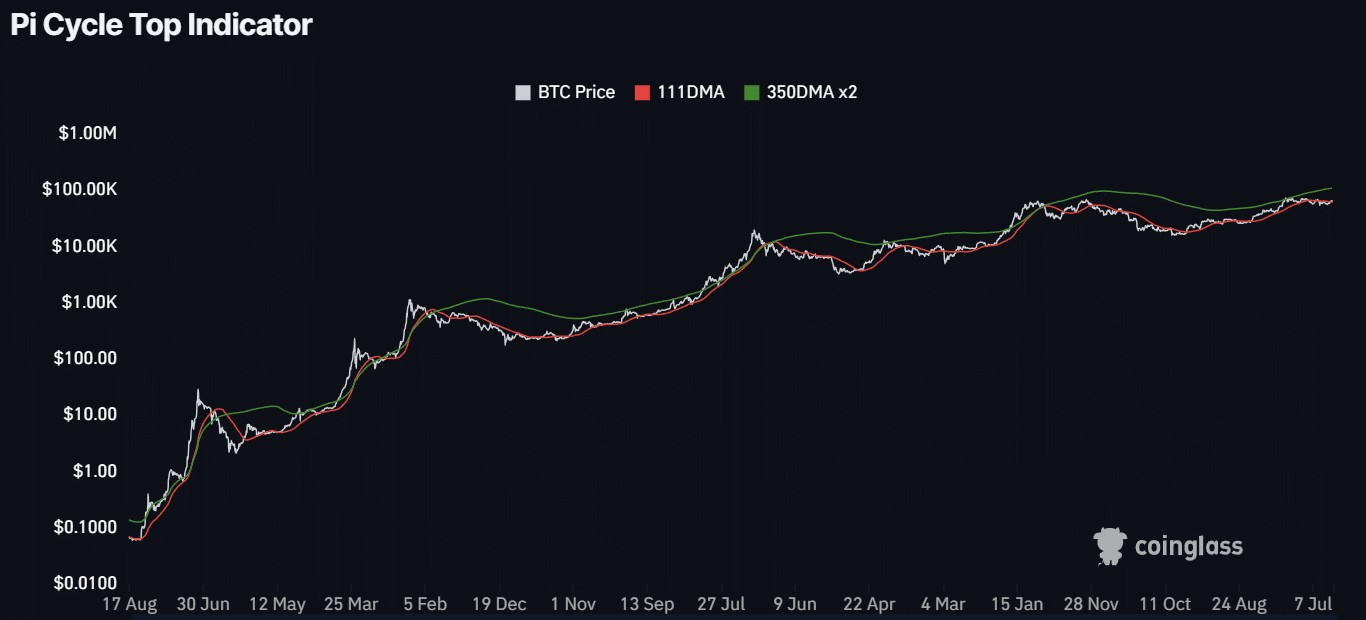 根據 Pi Cycle Top 指標,BTC 遠未觸及本週期頂部,這由 111 日移動平均線(MA)和 350 日移動平均線倍數(350 DMAx2)之間的巨大差距所示。