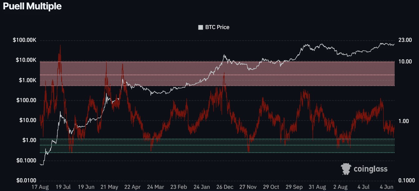 簡而言之,比特幣在發佈時相對被低估。普埃爾多重指標也表明了相似的展望,該指標通過評估比特幣礦工的盈利能力來判斷比特幣是否定價過高。