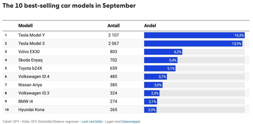 The gap between Tesla’s two mainstream vehicles and their competitors was notable as well. Norway’s third best-selling vehicle in September was the Volvo EX30, which saw 803 registrations. The fourth and fifth best-selling cars in the country were the Skoda Enyaq and the Toyota bZ4X, which saw 702 and 659 registrations, respectively.