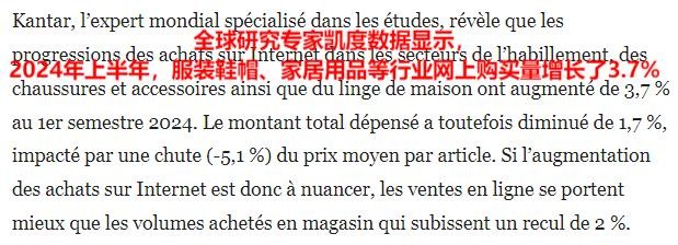 根據全球市場研究機構 Kantar 最新發布的數據,2024 年上半年,法國電商市場保持穩步增長,服裝、鞋類及配飾、家居用品的線上購買量同比增長了 3.7%。不過,受商品價格下跌影響(-5.1%),消費者總支出同比下降了 1.7%。