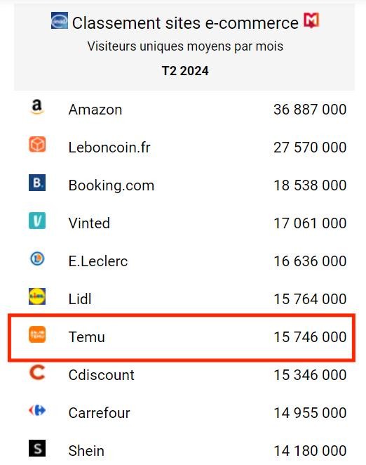 Temu 躍升法國第七大電商平台 圖源:Fevad