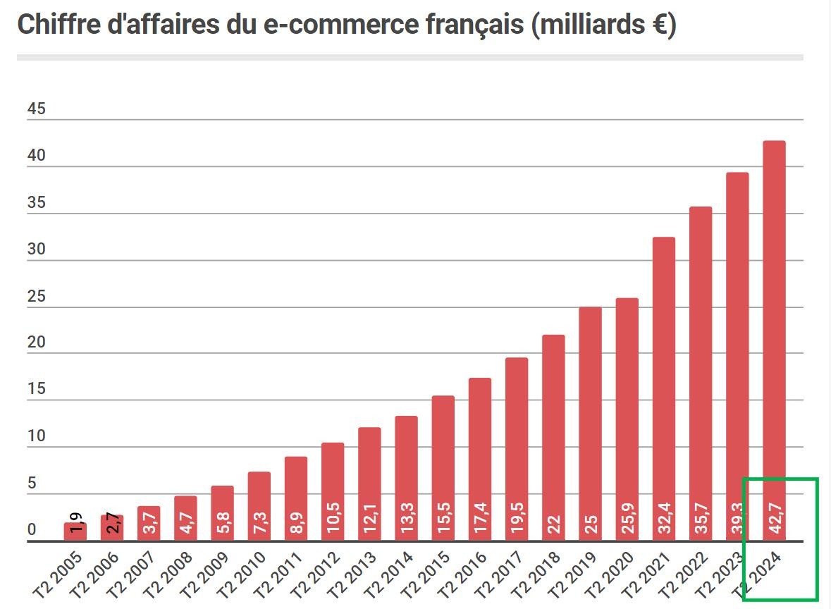 根據 Fevad 最新的報告數據,2024 年第二季度,法國在線銷售額(產品和服務)達 427 億歐元,同比大漲 8.4%;其中,在線訂單量同比增長 9.3%,平均訂單金額下降 1%,這説明整體消費盤正在顯著擴大。