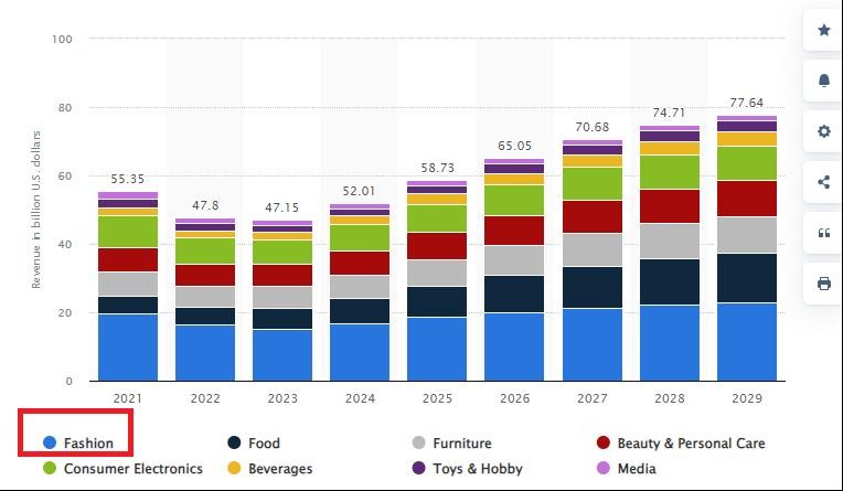 Statista 的數據同樣印證了這一趨勢:時尚品類在法國電商市場中穩居銷售榜第一,預計未來數年內,時尚品類還將繼續保持這一領先地位,市場份額佔比穩定在 30% 左右。