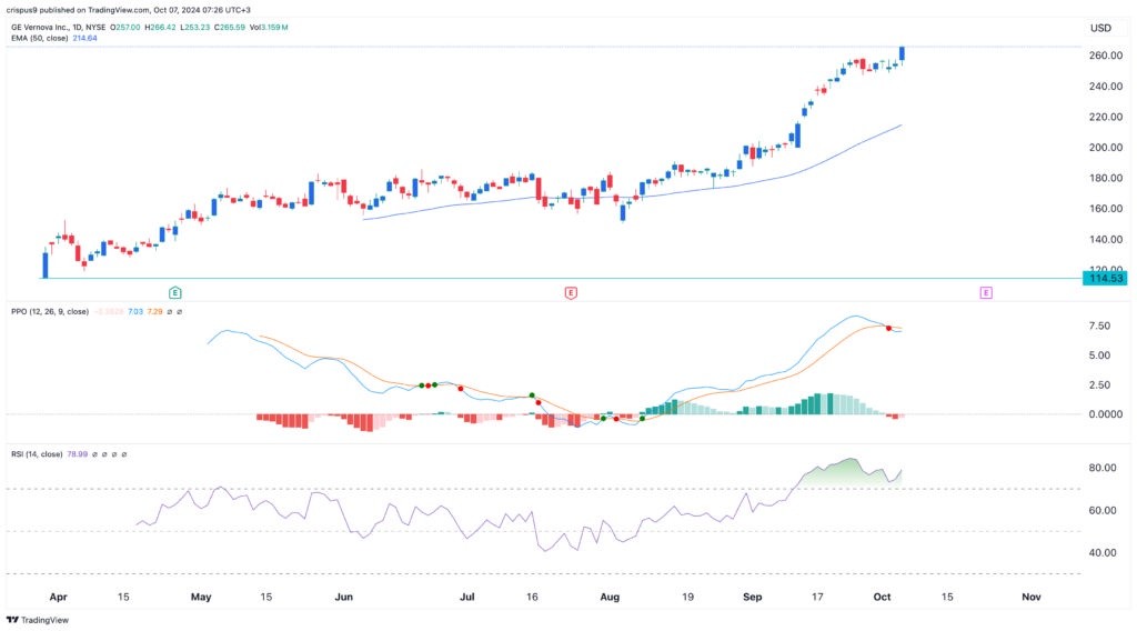 日線圖顯示,過去幾個月 GEV 股價一直處於強勁的多頭趨勢中。從 3 月的 114.53 美元上漲至 265 美元。