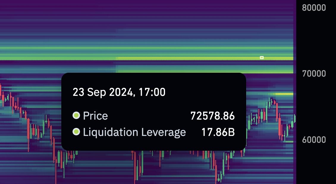 The last significant liquidation zone lies at $72,578, with $18 billion in short positions in liquidation risk.
