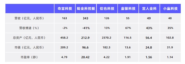 In 2023, including Qifutech, Lufax Holdings, Xinye Technology, Jiayin Technology, Yiren Digital, and Xiaoying Technology, the market value of 6 companies is generally lower than their total assets, and even companies like Lufax Holdings and Jiayin Technology have a market value lower than their revenue. The PE ratios of Yiren Digital and Xiaoying Technology are less than 2 times.