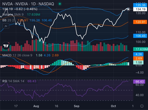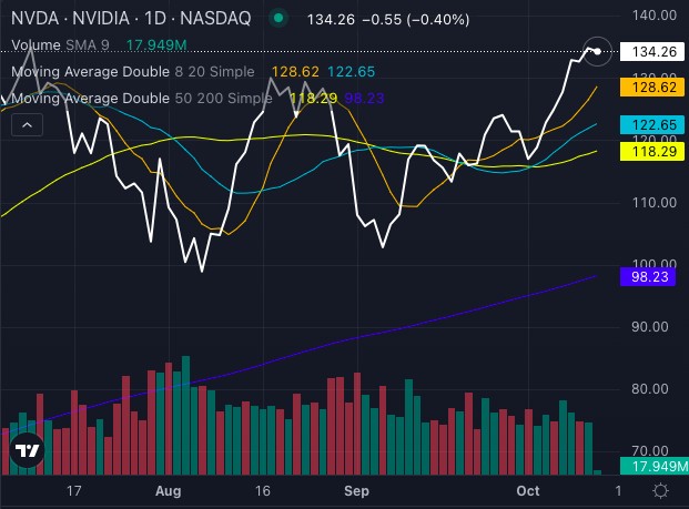 - 英偉達股票目前交易價為 134.26 美元,高於其五天、20 天和 50 天的指數移動平均線,顯示出強勁的多頭動能。