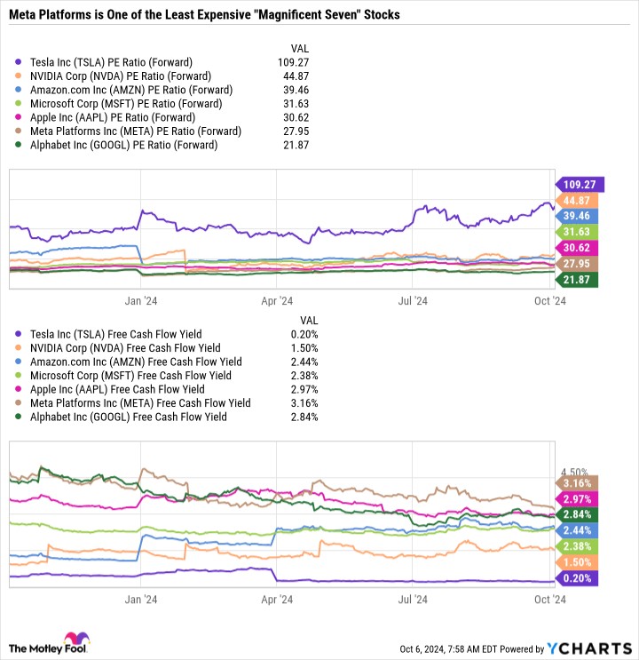 Perhaps the best reason that Meta Platforms could continue outpacing Amazon, and Alphabet is its valuation. As you can see in the following chart, Meta has the second-lowest forward price-to-earnings ratio (P/E) of the "Magnificent Seven" behind only Alphabet, but it has the highest free cash flow (FCF) yield.