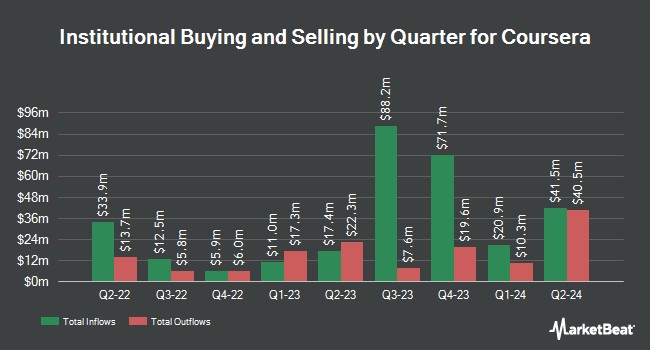 A number of other hedge funds have also added to or reduced their stakes in the stock. Natixis acquired a new position in Coursera during the 1st quarter valued at about $35,000. CWM LLC increased its holdings in shares of Coursera by 7,568.6% during the second quarter. CWM LLC now owns 3,911 shares of the company's stock valued at $28,000 after acquiring an additional 3,860 shares in the last quarter. Covestor Ltd raised its position in shares of Coursera by 72.9% in the 1st quarter. Covestor Ltd now owns 4,378 shares of the company's stock valued at $61,000 after purchasing an additional 1,846 shares during the last quarter. nVerses Capital LLC boosted its stake in Coursera by 26.1% in the 2nd quarter. nVerses Capital LLC now owns 8,700 shares of the company's stock worth $62,000 after purchasing an additional 1,800 shares in the last quarter. Finally, LGT Group Foundation purchased a new stake in Coursera during the 2nd quarter worth approximately $73,000. 89.55% of the stock is currently owned by institutional investors.