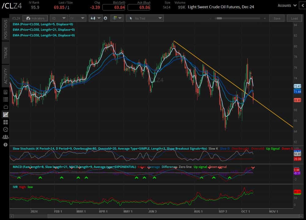 Crude oil futures (/CLZ4) plummeted this morning, dropping over 4%. The entire geopolitical risk premium priced in from earlier this month when Israel’s war with Gaza heated up have been nearly wiped out. The Washington Post reported yesterday that Israeli officials told the United States they would strike military targets instead of nuclear or oil-related infrastructure. Inventory data from the American Petroleum Institute (API) is due this morning.