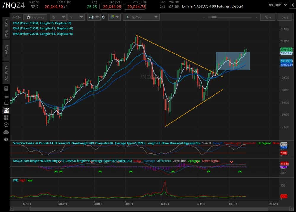 Nasdaq 100 futures were slightly higher ahead of the open this morning. The December contract (/NQZ4) was up 0.14% after trimming earlier losses. Bank of America (BAC) rose nearly 3% in pre-market trading after topping estimates and showing higher-than-expected trading revenue. Citigroup (C) rose 2% ahead of the bell, with the company reporting strong investment banking revenue. Johnson & Johnson (JNJ) fell despite topping third-quarter estimates. Traders are awaiting earnings from United Airlines (UAL) and Interactive Brokers (IBKR) after the bell.