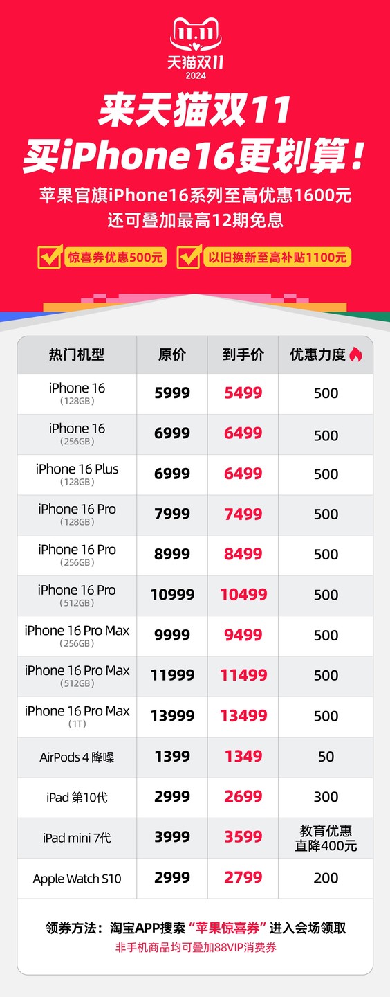 Taking the 128GB iPhone 16, originally priced at 5999 yuan, as an example, during the Tmall Double 11 event, after using the 500 yuan Tmall surprise voucher, the final price is only 5499 yuan. The popular model iPhone 16 Pro, when combined with a 500 yuan Tmall surprise voucher, will be priced at 7499 yuan, and can also enjoy 12 interest-free installments. Moreover, by trading in an old device at the Tmall Apple Store official flagship store, customers can receive up to an additional 1100 yuan subsidy for their old device. The Tmall Apple Store official flagship store is directly operated by Apple, and during Tmall Double 11, the products are guaranteed to be authentic, with shared inventory with the Apple Store online store, ensuring consistent official service. Currently, consumers can search for "Apple surprise vouchers" on the Taobao App to pre-collect them, and can place orders directly starting from 8:00 pm on October 21st