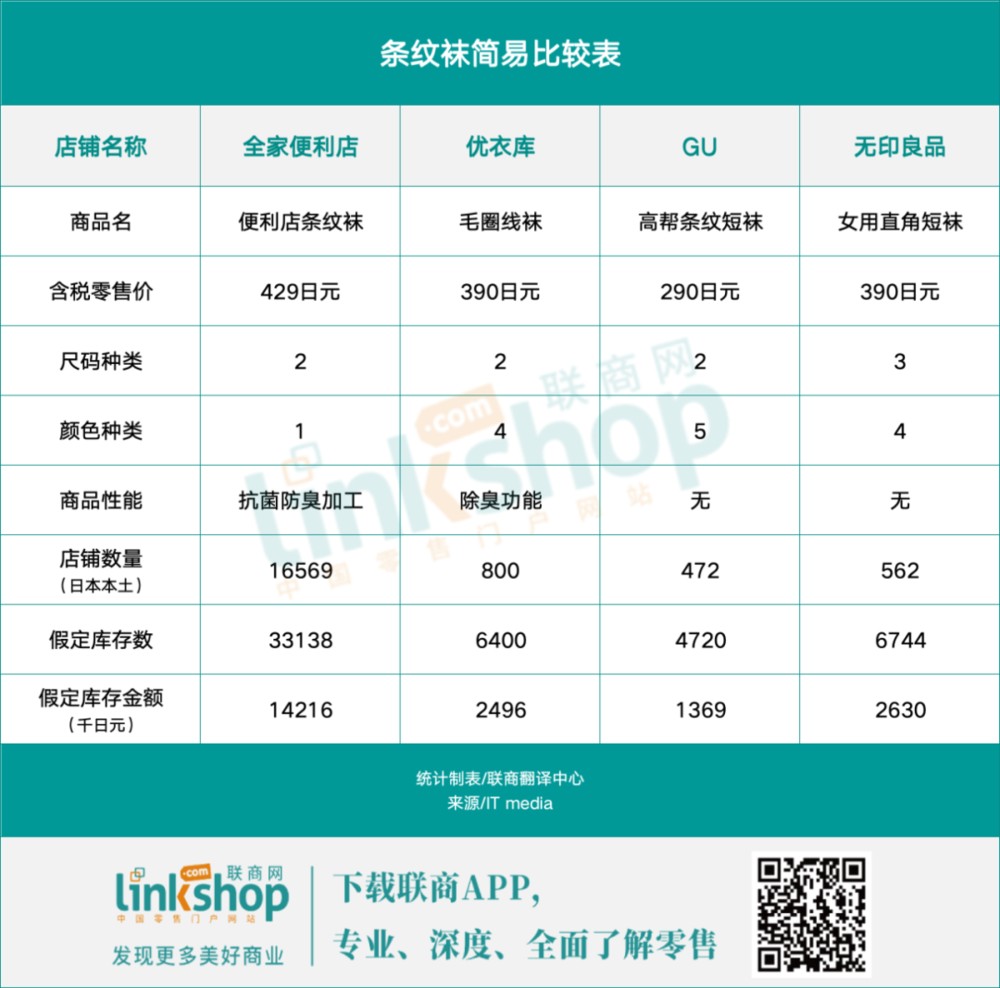 Compared to professional clothing chain stores, the Convenience Wear series products appear to be lacking in color and design, losing the fun of choice in the product lineup. In addition, there is no advantage in terms of price and size selection. However, the performance of the products is acceptable, which is a major highlight. Taking the popular striped socks and pure cotton t-shirts as examples, if each SKU is allocated one piece in all stores, let's take a look at the basic situation of FamilyMart's products compared to other major clothing brands.