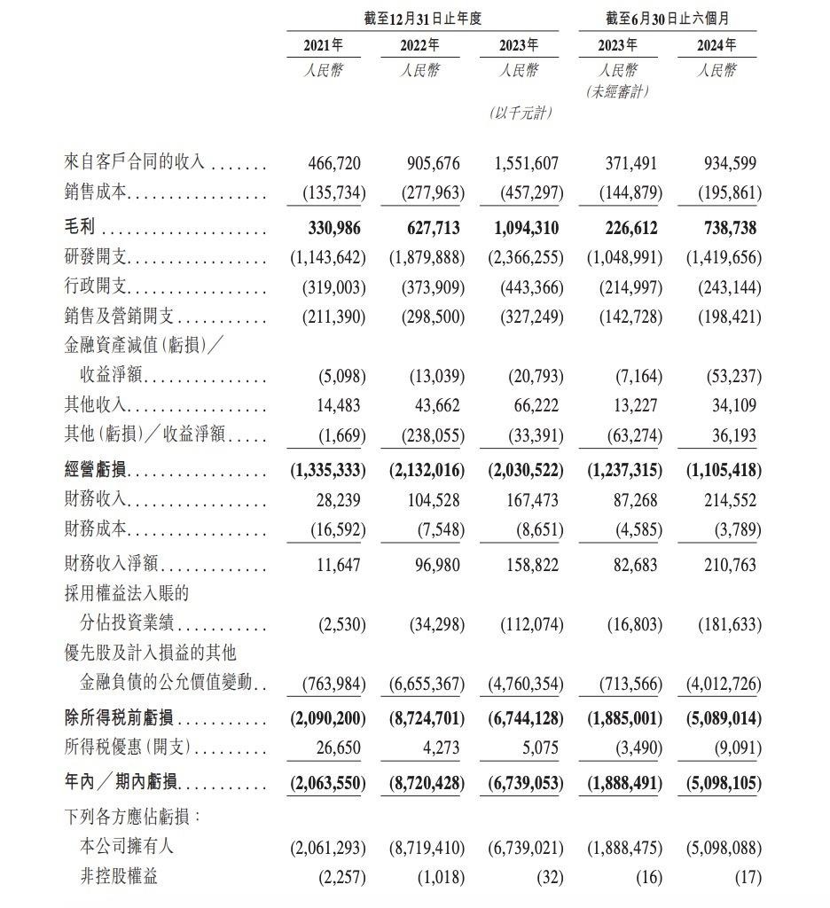 然而,在營收遞增的同時,公司的虧損幅度也在加大。地平線於 2021 年、2022 年、2023 年、2024 年上半年分別產生虧損達到了 20.6 億元、87.2 億元、67.4 億元以及 51.0 億元。