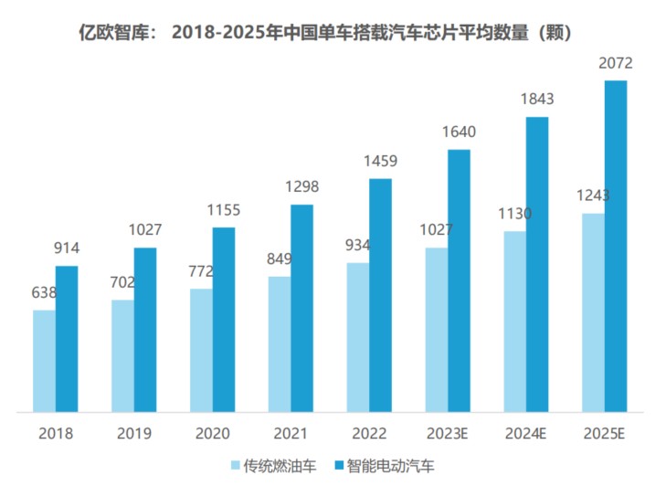 近年來隨着汽車電動化智能化發展,汽車整體行業對車規級芯片的需求也將隨之膨脹。據之前億歐智庫統計,基於未來單車芯片用量將持續上漲,到 2025 年,燃油車平均芯片搭載量將達 1243 顆,智能電動汽車的平均芯片搭載量則將高達 2072 顆。
