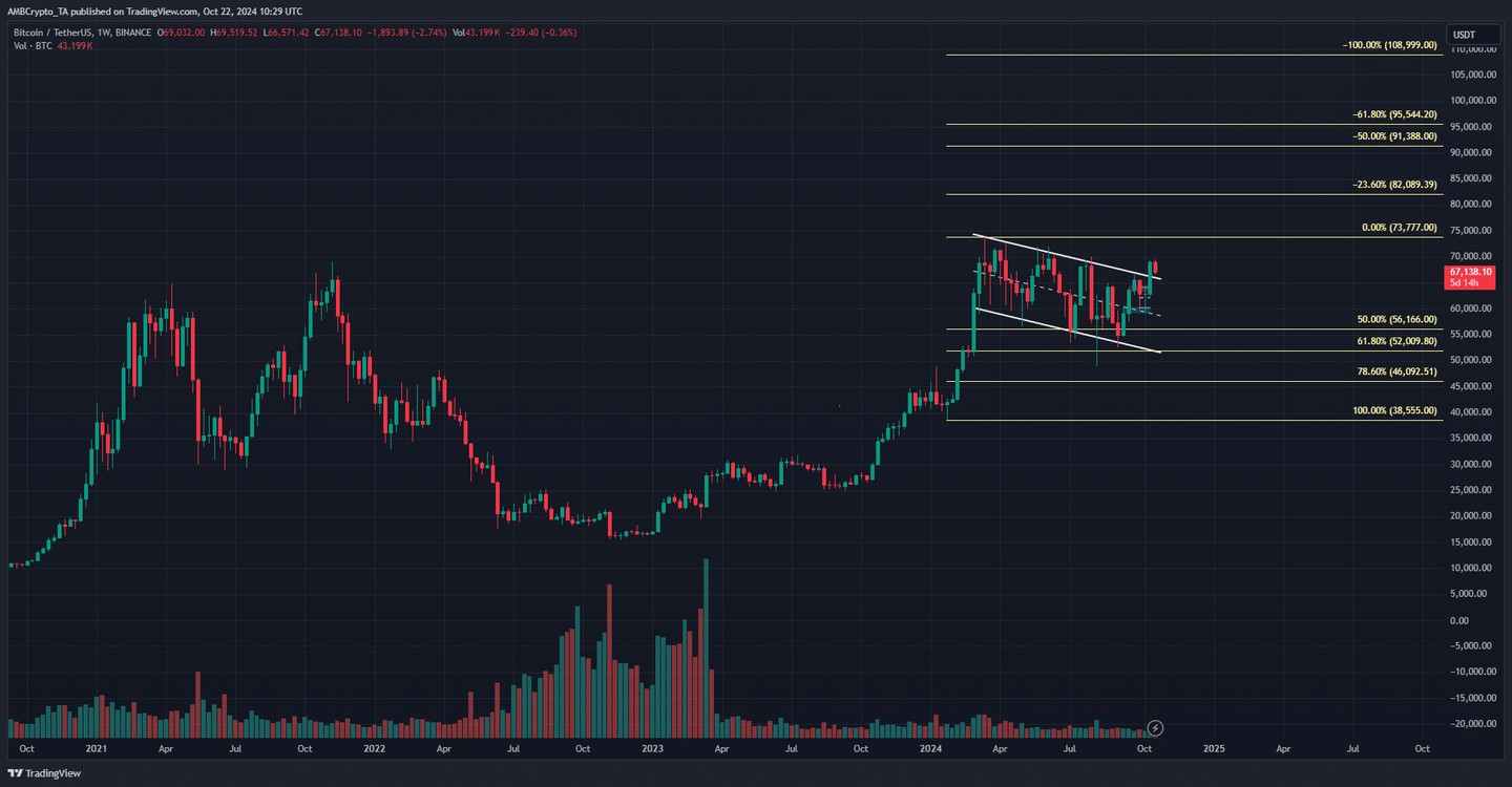 82,000 美元和 95,500 美元是此次上漲的目標。價格已經回撤至 61.8% 的回撤水平。突破從 70,000 美元開始的一系列低點將是一個良好的第一步。