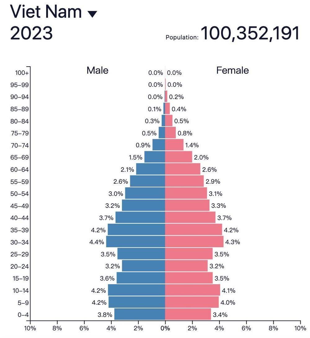 By the end of 2023, data from the Vietnamese Statistics Office shows that Vietnam's population has reached 100.3 million, making it the fifteenth country in the world with a population exceeding 100 million. Nearly 70% of the population is of working age, making Vietnam a relatively young country compared to Japan, where the working-age population is 59%.