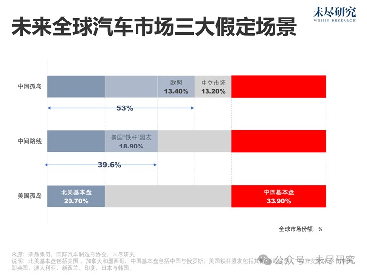 榮鼎集團認為,一旦合作伙伴有能力或有意願選擇中立,那麼,由於規模經濟效應,以及產業競爭力等因素,美國很難單獨與中國競爭這雙方基本盤以外的 45% 的自由市場。最糟糕的情況,北美市場未必沒有可能成為全球化的 “孤島”,即除北美以外的市場,全部選擇繼續加碼更具 “性價比” 的中國供應鏈。在兩年前,日本還是第一大汽車出口國,德國第二,全球市場影響力大於美國車企;從市場規模來看,美國也不如中國。汽車產業對於歐盟和日本經濟的重要性,要遠大於美國,它們為什麼一定要跟隨美國推行的這套 “聯網汽車禁令” 呢?禁令有可能侷限於北美。