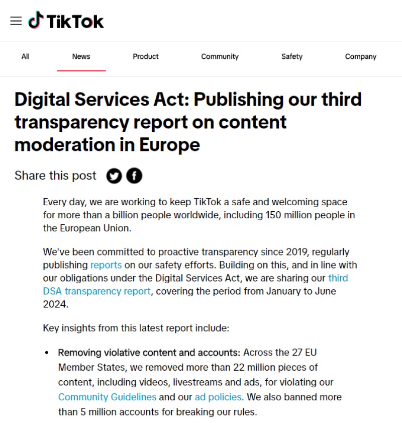 10 月 25 日消息,TikTok 日前公佈了其最新的歐盟用户和內容審核數據,作為其基於歐盟 DSA 法案披露義務的一部分。最新報告涵蓋了今年 1 月至 6 月之間的數據,是 TikTok 第一份涵蓋整個六個月時間段的報告。TikTok 之前已經發布過兩份 DSA 報告,一份涵蓋單個月度數據,另一份涵蓋截至去年的三個月數據。數據顯示,TikTok 目前在歐盟擁有 1.505 億月活躍用户。與上一份報告相比,TikTok 的用户數量增加了 800 萬。