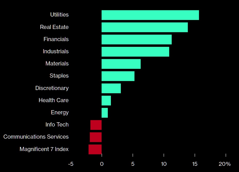 自 7 月 10 日以來,Mag 7 的累計回報遠落後於其它行業,錄得 2% 的跌幅,而包括公用事業、地產、金融和工業在內的板塊均累計上漲了 10% 以上。