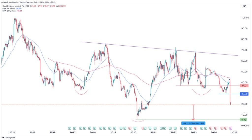 Capri Holdings 股價正朝着 75% 的崩盤方向發展,首次出現在 Invezz 上。