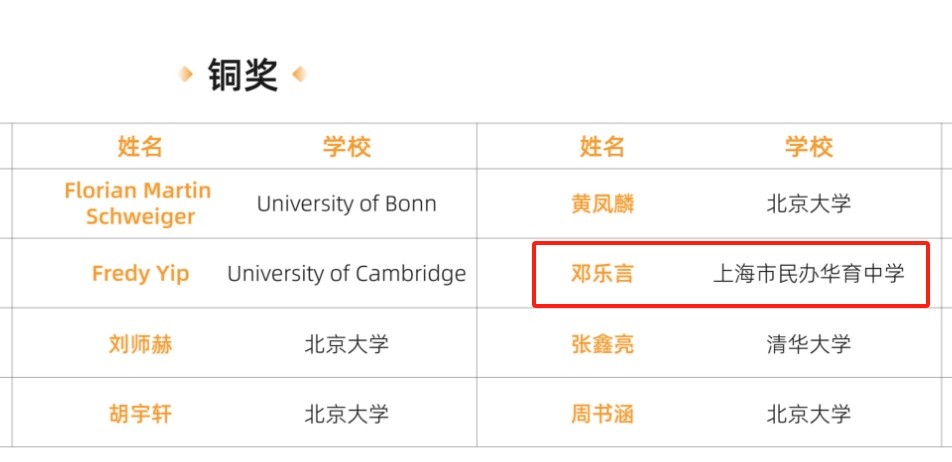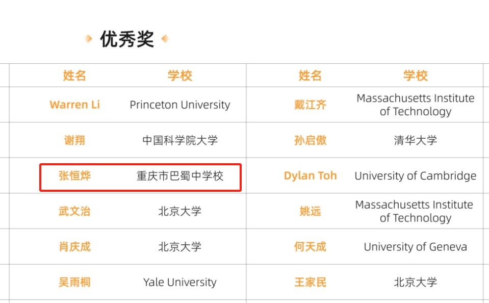 Among the winners, 39 are from Peking University, and 6 are from Tsinghua University, with winners from these two universities accounting for more than half. Notably, there are two winners from high schools. One is Deng Leyan from Shanghai Minban Huayu Middle School, who won a bronze medal; the other is Zhang Hengye from Chongqing Bashu Middle School, who received an excellence award.