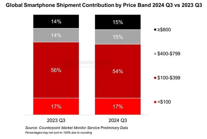 由於大多數主要品牌都實現了強勁的收入增長,≥400 美元的細分市場在 2024 年第三季度的淨份額同比上漲了 2%。各個地區持續的高端化浪潮激勵着手機品牌廠商重新考慮其高端產品組合和設備融資策略。預計高端化趨勢將在未來幾年繼續,預計全球智能手機平均售價將在 2023 年至 2028 年期間以 3% 的複合年增長率增長。