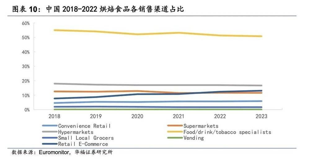 近年來我國烘焙門店在烘焙食品渠道的佔比下降。根據歐睿國際數據,中國烘焙食品在 Food/drink/tabacco specialists 這一零售渠道的銷售額佔比,從 2018 年的 55% 下降至 2022 年的 51.3%。