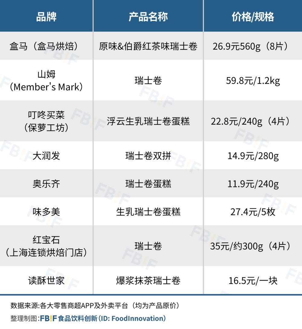 FBIF 在上海閔行區隨機選取一個位置,在各大零售商超 APP 及外賣平台上搜索 “瑞士捲”,製作瞭如下表格。