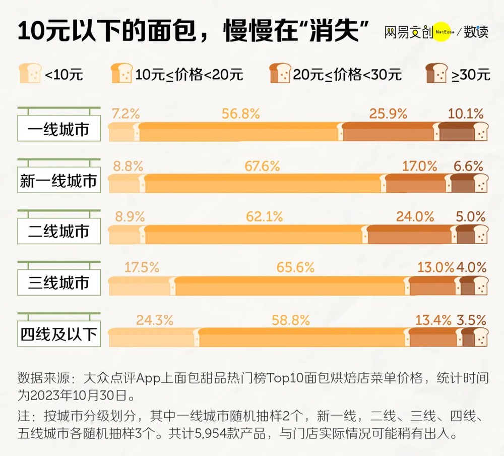 消費者對於烘焙價格也有高敏感度。目前,在社交媒體上,消費者對線下烘焙門店圖吐槽最多的問題就是 “貴”。網易數讀曾做過這樣一個統計:10 元以下的麪包,慢慢在 “消失”。