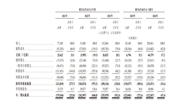 財務方面,2021 年、2022 年、2023 年及 2024 年截至 6 月 30 日止六個月,希迪智駕實現收入分別約為人民幣 7738.5 萬元、3105.6 萬元、1.33 億元、2.58 億元;同期虧損約人民幣 1.795 億元、2.63 億元、2.55 億元、1.23 億元。