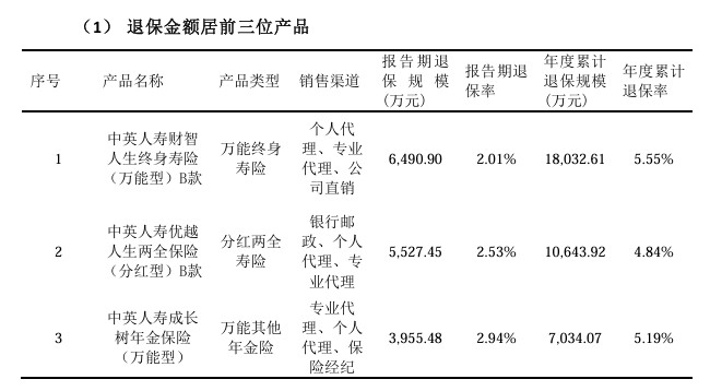 退保金額居前三的產品今年累計退保規模達 3.57 億元,其中僅第三季度退保規模約為 1.6 億元,年度累計退保規模的 44.73%。此外,中英人壽單三季度綜合退保率為 2.11%,較去年同期的 1.81% 增加 0.3 個百分點。