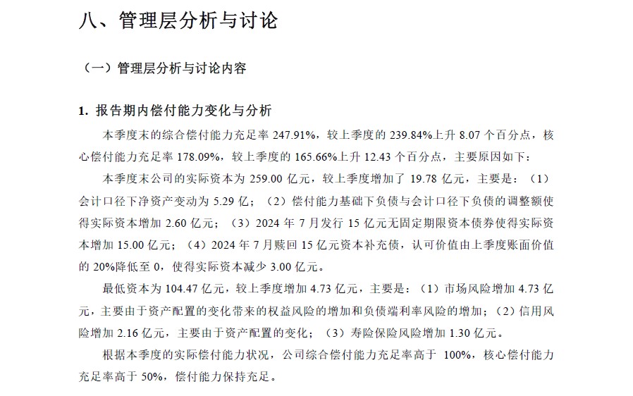 償付能力方面,本季度末的綜合償付能力充足率 247.91%,較上季度的 239.84% 上升 8.07 個百分點,核心償付能力充足率 178.09%,較上季度的 165.66% 上升 12.43 個百分點。