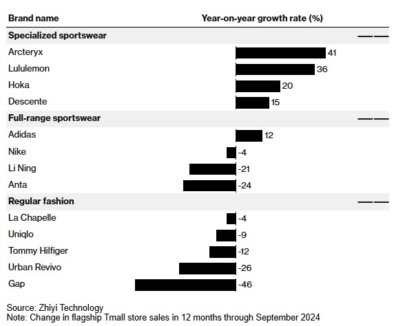 但在地球的另一端,Lululemon 卻在狂歡。摩根士丹利上月表示,它已成為中國第三大外國運動服裝品牌。Lululemon 是户外裝備製造商 Arc’teryx、鞋類公司 Hoka 和滑雪服裝品牌 Descente 等小眾運動休閒品牌中的領軍者。分析公司 Hangzhou Zhiyi Technology 數據顯示,在截至 9 月的 12 個月裏,該品牌在阿里巴巴主要平台天貓上的門店銷量增長了約 15% 至 40%。耐克該公司售價 600 美元的夾克和 150 美元的瑜伽褲在市場上熱銷,即便是在充斥着以三分之一價格兜售 “山寨” 該公司服裝的廉價本土品牌的情況下。