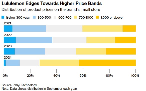 9 月份,售價在人民幣 1,000 元 (合 140 美元) 以上的產品佔其天貓銷售額的 40% 以上,而三年前同期這一比例僅為 10%,這突顯了 Lululemon 對中國消費者新潮流的適應能力。