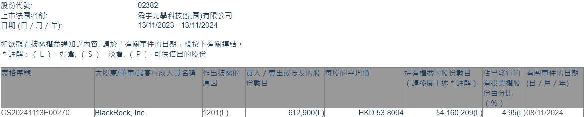 According to the latest information from the Hong Kong Stock Exchange, on November 8th, BlackRock reduced its holdings in SUNNY OPTICAL (02382) by 612,900 shares, at a price of HKD 53.8004 per share, totaling approximately HKD 32.9743 million. After the reduction, the latest number of shares held is approximately 54,160,200, with a latest holding ratio of 4.95%.