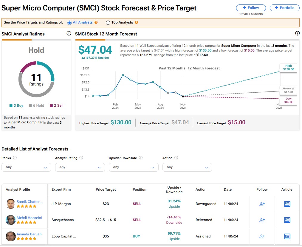 Super Micro Computer’s stock has a consensus Hold rating among 11 Wall Street analysts. That rating is based on three Buy, six Hold, and two Sell recommendations made in the last three months. The average SMCI price target of $47.04 implies 167.27% upside from current levels.