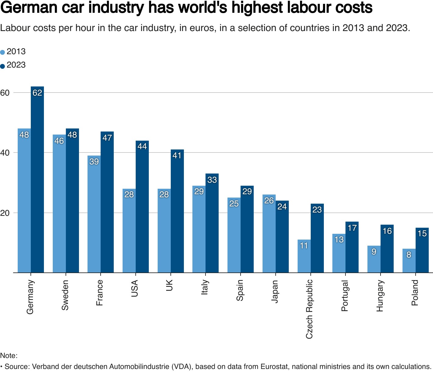 Germany, where Volkswagen employs nearly 45% of its workforce, has the highest labour costs of any passenger car industry worldwide, averaging 62 euros ($66) per hour in 2023, up around a third from a decade ago, according to the German autos association VDA.