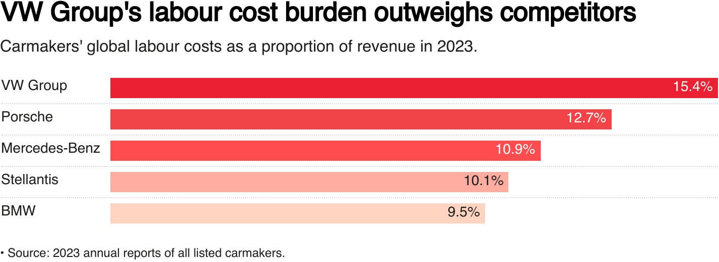 The proportion of revenue spent on labour at Volkswagen globally has fallen from 18.2% in 2020 to 15.4% in 2023 - but that ratio still exceeds BMW (BMWG.DE) , Mercedes-Benz (MBGn.DE) , and Stellantis (STLA.MI) , which spent between 9.5% and 11% in 2023, according to the works council memo.