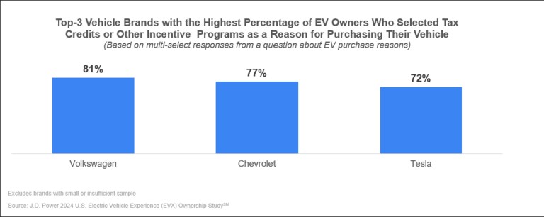 Customers of Volkswagen, Chevrolet, and Tesla electric vehicles cited incentives as drivers for their EV purchases. Overall, 81% of Volkswagen EV buyers chose their vehicle due in part to the Clean Vehicle Credit. The same was true for 77% of Chevrolet buyers and 72% of Tesla customers. Tesla ranks highest among premium segment brands in terms of the influence of tax credits on purchase decision, as noted by J.D. Power in a press release.