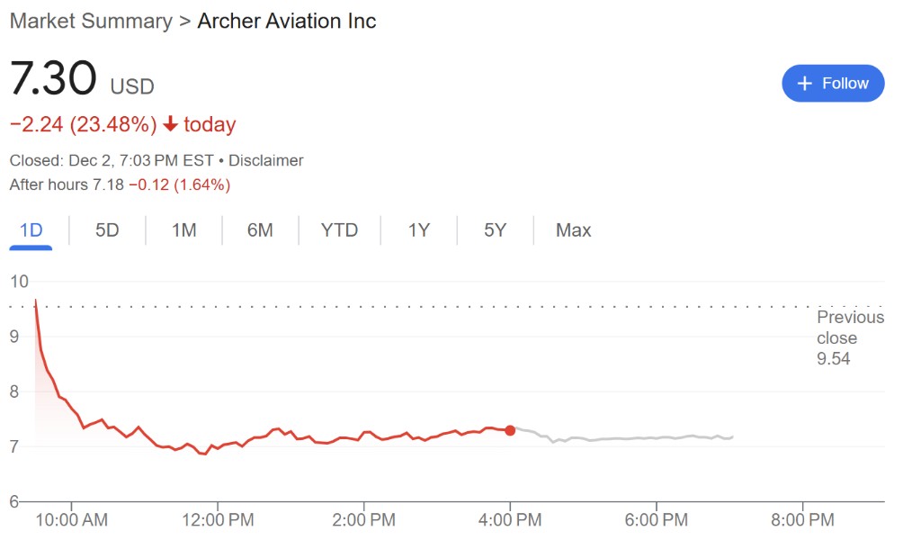 Archer's decline was particularly exaggerated, with analysts suggesting it may be due to the unexpected resignation of Stellantis Group CEO Carlos Tavares, which caused market unease regarding the future relationship between Archer and Stellantis, leading to some profit-taking.