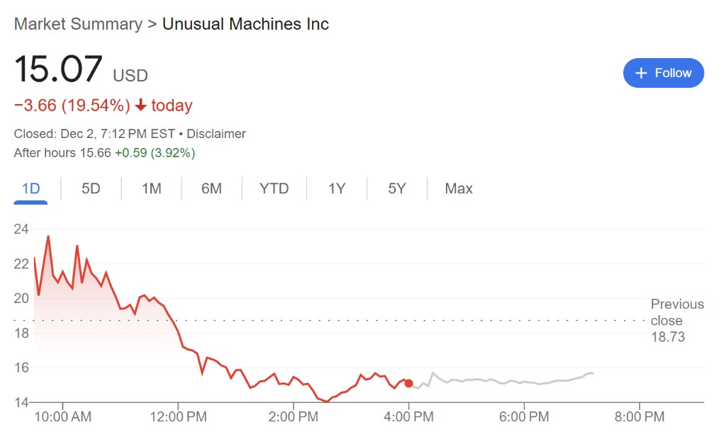 Unusual Machines' stock price fell 19.5% on Monday, but it had previously risen 89% and 85% in the two trading days before. This was driven by Elon Musk's support for drones and the news that Donald Trump's son, Donald Trump Jr., became an advisor to Unusual Machines, which boosted its stock price
