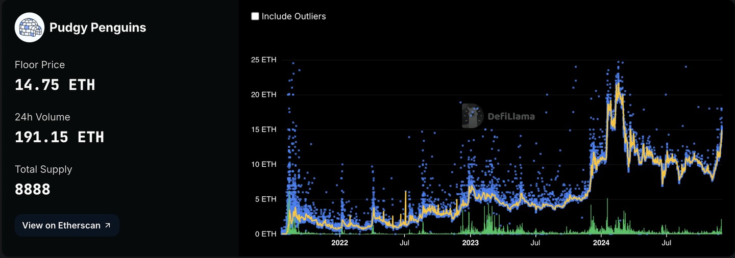 The floor price for Pudgy Penguins climbed from 8.7 ETH to 14.75 ETH at the time of writing, translating to a 51% increase and roughly over $53,350 in value.