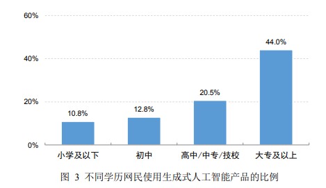 From the perspective of different education levels, internet users with a college degree or higher have a significantly higher usage rate of generative artificial intelligence products, reaching 44.0%; while users with an education level below college have a usage rate of 14.1%.
