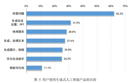 In terms of usage, large models are playing an increasingly significant role in content creation. The report shows that nearly two-thirds of users use LLM (Large Language Model) services to answer questions, while one-third rely on them as work assistants to generate meeting minutes and slides.