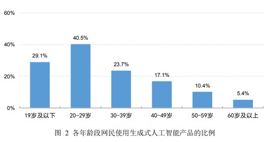 In terms of users, young internet users are the main users of AI products. By age group, the proportion of internet users aged 20-29 using generative AI products is the highest, reaching 40.5%, followed by users aged 19 and below, with a proportion of 29.1%.