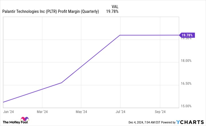 In Q3, Palantir's revenue rose 30% year over year to $726 million. U.S. clients spent more than their international counterparts, with U.S. commercial revenue rising 54% year over year to $179 million and U.S. government revenue rising 40% year over year to $320 million. Palantir is also solidly profitable, posting a profit margin of around 20% for the second straight quarter.